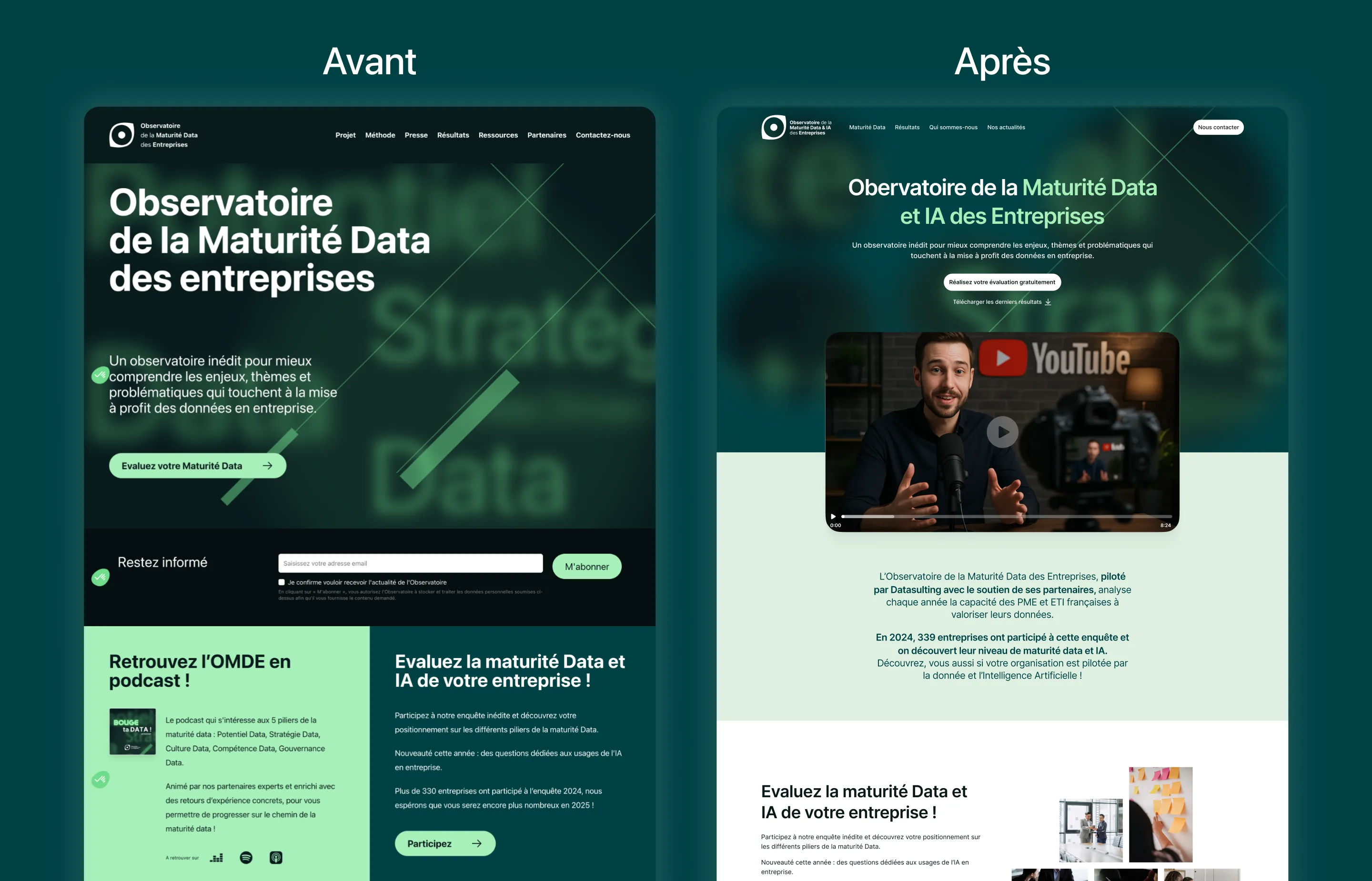 La situation s'est complexifiée quand l'observatoire a évolué pour intégrer la dimension IA à son périmètre. De l'Observatoire de la Maturité Data des Entreprises, ils devenaient l'OMDIE. Une transformation stratégique majeure que leur site web ne pouvait pas suivre facilement.